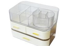 It is very compact in size and lightweight to hold, making it very suitable to be placed in a corner of the dormitory desktop. Don’t be fooled by his small size, the multi-layered design can hold all your beauty products. The upper layer is suitable for lipstick, brush and skin care products, and the lower layer is specially designed for eye shadow, powder blusher and powder makeup plates. With this cosmetics storage box, the dormitory desktop becomes tidy and orderly.