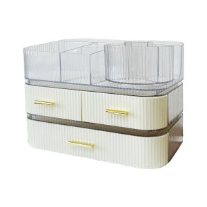 【All-in-One Makeup Organizer】This cosmetic storage box has three functional areas, which can neatly organize your skincare products, lotions, lipsticks, makeup brushes, and jewelry. It has a wide range of applications and can make your bathroom and dresser tidy and orderly.