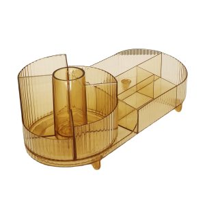 The circular part is perfect for placing makeup brushes, lipstick, and other slender items, keeping them upright and neatly arranged. The adjacent rectangular compartments provide ample space for larger products such as color palettes, bottles, and containers.